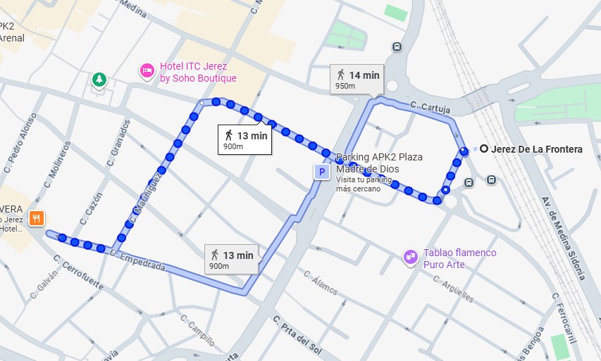 -> Si vienes en transporte público como por ejemplo el tren, la estación de Jerez está a tan solo 13 minutos andando del Palacio Villapanés
